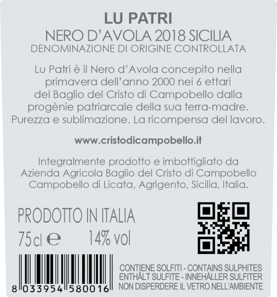 Lu Patri è un Nero d’Avola in purezza, concepito nella primavera dell’anno 2000. Le uve impiegate per questo vino provengono da sei ettari del Cristo di Campobello da lungo tempo di proprietà del Baglio. Le uve vengono vendemmiate a mano a cavallo dei mesi di settembre e ottobre, quando hanno raggiunto la perfetta maturazione aromatica e fenolica e sono per questo in grado di dar vita a un vino di grande complessità e profondità. L’aspetto è quello del classico rosso siciliano, caratterizzato da un colore rubino carico e impenetrabile. Basta uno sguardo per capire che quello che abbiamo nel bicchiere è un vino di grande carattere e personalità travolgente. Al naso, note balsamiche e di erbe aromatiche. Poi richiami alla frutta fresca, con mora e amarena. In bocca, invece, è soprattutto morbido e rotondo. Di notevole persistenza gustativa, è un vino complesso e caldo, avvolgente e speziato. I tannini eleganti lo rendono un vino dotato di lunghissima persistenza. Buono, anzi molto buono oggi, è un rosso che non teme le prime rughe sull’etichetta. Gelosamente custodito in cantina, saprà evolvere per almeno altri dieci anni.