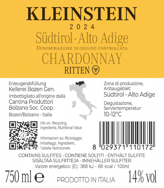 Attorno alla città di Bolzano, nel cuore dell'Alto Adige, si trovano dei ripidi pendii che, nonostante rendano le lavorazioni molto faticose, sono ideali per la coltivazione della vite. Qui i filari possono godere di una eccellente insolazione e la grande escursione termica tra giorno e notte rendono i frutti particolarmente intensi nei profumi e ricchi in termini di gusto. Kleinstein è uno Chardonnay che proviene proprio da questi appezzamenti collinari, circa 500 metri sul livello del mare. Un vino ricco che viene fatto maturare per alcuni mesi sulle sue fecce fini e che, in parte, viene fatto fermentare in barrique. Ne deriva un vino caratterizzato da un colore giallo paglierino intenso, con riflessi dorati. Al naso note esotiche di ananas, mango e melone, a cui si aggiungono ricordi di vaniglia e banana. In bocca è elegante e fresco, grazie a un’acidità ben bilanciata e a una mineralità pronunciata.