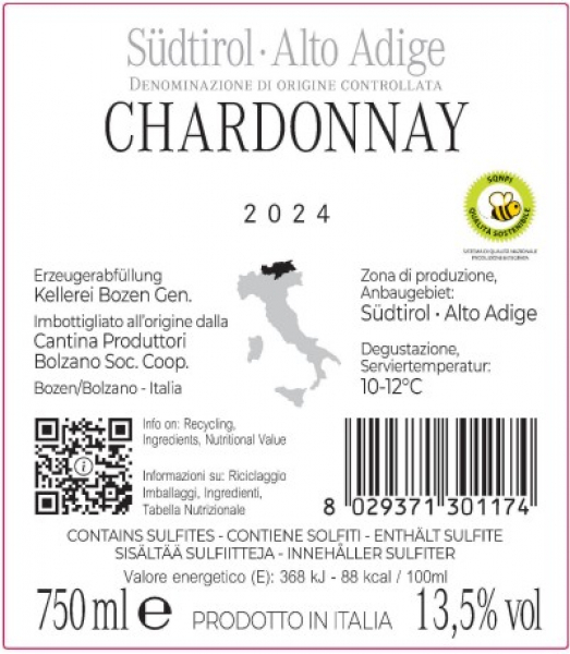 L'Alto Adige DOC Chardonnay di Cantina Bolzano è eleganza e freschezza. Un bel vino di montagna, prodotto esclusivamente da uve Chardonnay coltivate tra i 350 e i 500 metri sul livello del mare. Ci troviamo nel cuore dell'Alto Adige, tra paesaggi mozzafiato e pendii ripidi. Qui le condizioni climatiche sono ideali per la viticoltura, grazie a fresche correnti alpine e alla bella insolazione. I terreni sono caldi, secchi e ricchi di minerali che garantiscono alle viti una crescita equilibrata, esaltando le caratteristiche aromatiche delle uve. I vigneti di Cantina Bolzano sono gestiti con metodi sostenibili e rispettosi dell’ambiente. Si parte con una selezione manuale delle uve, raccolte al giusto grado di maturazione per garantire un perfetto equilibrio tra acidità e dolcezza. In cantina le uve vengono sottoposte a una pressatura soffice per estrarre solo il mosto fiore che viene sottoposto a fermentazione a temperatura controllata in serbatoi di acciaio inox. Successivamente, il vino matura in acciaio, conservando le caratteristiche varietali dello Chardonnay e mantenendo una vivace acidità. Nel calice questo Chardonnay si presenta di un colore giallo paglierino chiaro, arricchito da riflessi dorati. Al naso è complesso e invitante, con note esotiche di ananas, mango e melone, oltre a un tocco di agrumi che aggiunge freschezza. In bocca è elegante e avvolgente, caratterizzato da una piacevole acidità ben bilanciata dalla naturale morbidezza. Il finale è fresco e persistente. Grazie alla sua versatilità e alla freschezza, questo Chardonnay è ideale come aperitivo, ma si sposa bene con un menù di pesce o con sushi e sashimi.