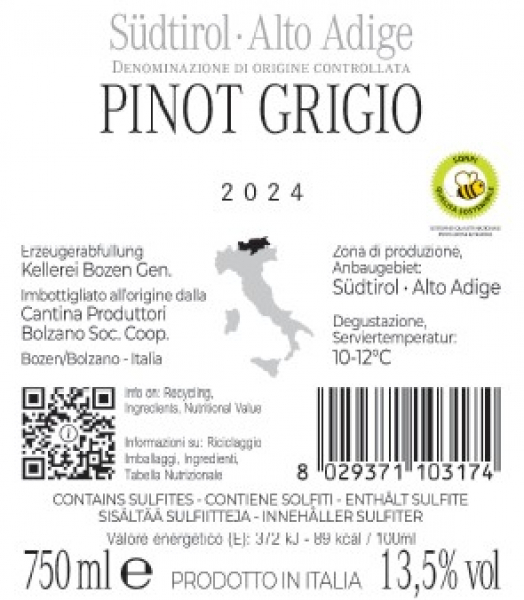 Alto Adige DOC, questo Pinot Grigio firmato da Cantina Bolzano è un vero e proprio "must". Il Pinot Grigio, del resto, fa parte della grande famiglia delle uve nobili della Borgogna, perfettamente ambientata anche ai piedi delle montagne Altoatesine. Qui, infatti, il Pinot Grigio sviluppa un aroma deciso, una struttura importante e, soprattutto, un grande carattere. Nello specifico le uve usate per produrre questo vino provengono da terreni soleggiati, alluvionali e ghiaiosi a Bolzano e sul Renon. Qui la vendemmia si svolge a inizio settembre. Le uve, sane e perfettamente mature, vengono portate in cantina per essere vinificate in modo tradizionale, con pressatura soffice, fermentazione a temperatura controllata e successiva maturazione in serbatoi di acciaio per mantener la freschezza del vino. Colore giallo paglierino intenso con riflessi dorati, al naso rivela un bouquet tipico, con note di mela e pera, miele e frutta secca. In bocca è strutturato e piacevole. Morbido e con un’equilibrata acidità. Sulla tavola, accompagna bene piatti a base di funghi, pesci d’acqua dolce e zuppe di pesce. Ottimo anche con frutti di mare.