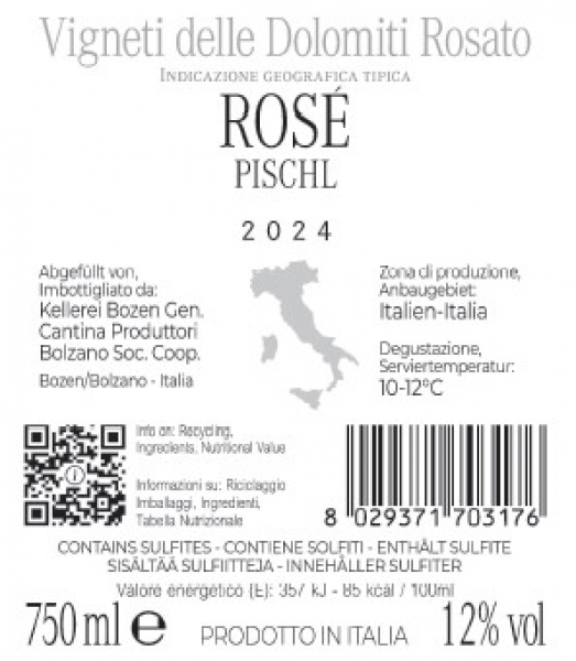 Pischl è un rosato proposto da Cantina Bolzano. Vigneti delle Dolomiti IGT è un vino fresco e fruttato che può essere servito anche leggermente freddo come aperitivo o in accompagnamento a piatti leggeri. Nasce da una lavorazione in cantin di uve selezionate nei vigneti del territorio, posti a circa 250 metri sul livello del mare. In questo caso la vendemmia inizia nella seconda parte di settembre. Le uve migliori, vengono conferite in cantina per essere avviate a trasformazione. La vinificazione ha inizio con una fase di pressatura delicata, seguita da una breve macerazione. La fermentazione in bianco viene svolta a temperatura controllata in serbatoi d’acciaio. Quel che si ottiene è un vino caratterizzato da un bel colore rosa cerasuolo di media intensità. Al naso il bouquet è fruttato, con aromi di fragola, lampone e ciliegia. Poi note floreali di viola e accenni di marzapane. In bocca, infine, si rivela elegante, con una struttura equilibrata, fresco e sapido. La sua forza è senza dubbio la versatilità. Adatto fin dal momento dell’aperitivo, si accompagna bene con antipasti freddi, tartare di manzo, pasta e pizza. Perfetto anche con piatti vegetariani.