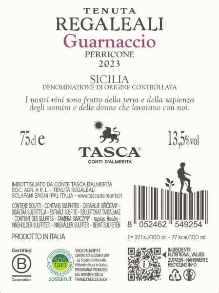 Il Perricone, chiamato affettuosamente "Guarnaccio" dai vignaioli di Regaleali, è un vitigno autoctono di rara eleganza, coltivato nella Tenuta sin dal 1959. Le sue radici affondano nello storico vigneto San Lucio, un pezzo di terra che ha permesso di preservare e valorizzare questo tesoro enologico. Ci troviamo in un ambiente collinare, a circa 480 metri sul livello del mare, dove il sole siciliano scalda la terra, mentre le notti fresche, tipiche di questa zona interna, mantengono le uve sane e ricche di profumi. Il terreno, un mix di argilla fine e calcare, conferisce al vino una struttura importante e un'anima minerale che lo rende unico. La produzione del Guarnaccio inizia con la vendemmia manuale delle uve che vengono raccolte nel mese di settembre. In cantina queste vengono fatte fermentare in vasche d'acciaio inox a temperatura controllata per circa 13 giorni, estraendo al meglio i profumi e il colore dalle bucce. Quindi, completata la fermentazione malolattica, il vino viene affinato per 12 mesi in barrique di rovere francese di secondo e terzo passaggio, acquisendo maggiore complessità, senza che il legno prenda il sopravvento e ne copra il carattere varietale. Nel calice il Perricone Guarnaccio si presenta di un colore rosso rubino intenso e brillante. Al naso, sentori fruttati di gelso e frutti rossi in confettura. Poi note speziate di pepe e chiodi di garofano, chiudendo con un inaspettato tocco balsamico di eucalipto. In bocca si scopre un vino di grande struttura, con tannini presenti ma levigati e una bella freschezza che bilancia il calore. Il sorso è avvolgente, lungo, e lascia una piacevole sensazione di persistenza. Per un abbinamento tradizionale, questo rosso si sposa bene con un piatto di pasta con sugo di carne, come un ragù robusto, oppure con arrosti o una grigliata di carni rosse. Ottimo con formaggi saporiti.