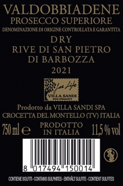 Il Valdobbiadene Prosecco Superiore DOCG "Rive di San Pietro di Barbozza" di Villa Sandi nasce da un'attenta selezione di uve provenienti dalle colline di San Pietro di Barbozza, nel comune di Valdobbiadene, uniche per microclima e pendenza. La vendemmia è rigorosamente manuale per dar vita a un Prosecco "in tiratura limitata", capace di esaltare il particolare territorio di origine. Millesimato e raffinato, si caratterizza per il suo perlage minuto e persistente, un sapore morbido che si prolunga per diversi secondi dopo aver bevuto. Prodotto nella versione Brut Nature, è un Prosecco di ottima struttura capace di reggere il confronto sia con piatti di carne che di pesce.